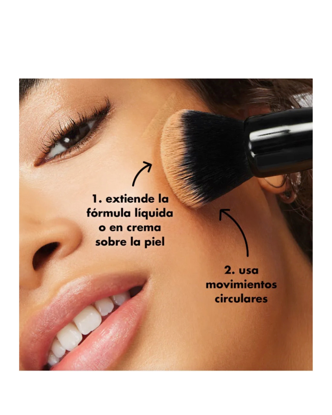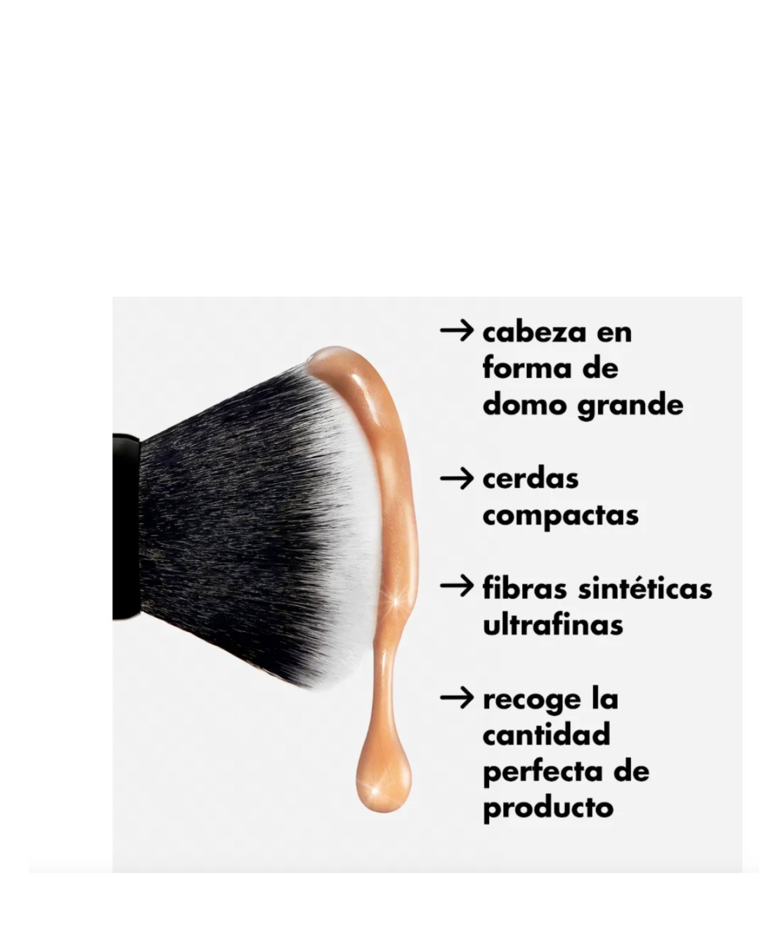 Brocha de alta precisión con cerdas sintéticas (vegana), diseño denso y redondeado – Aplica y difumina base líquida o crema con acabado impecable y natural.